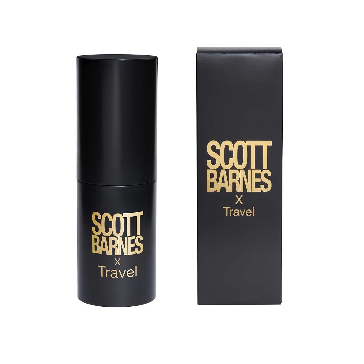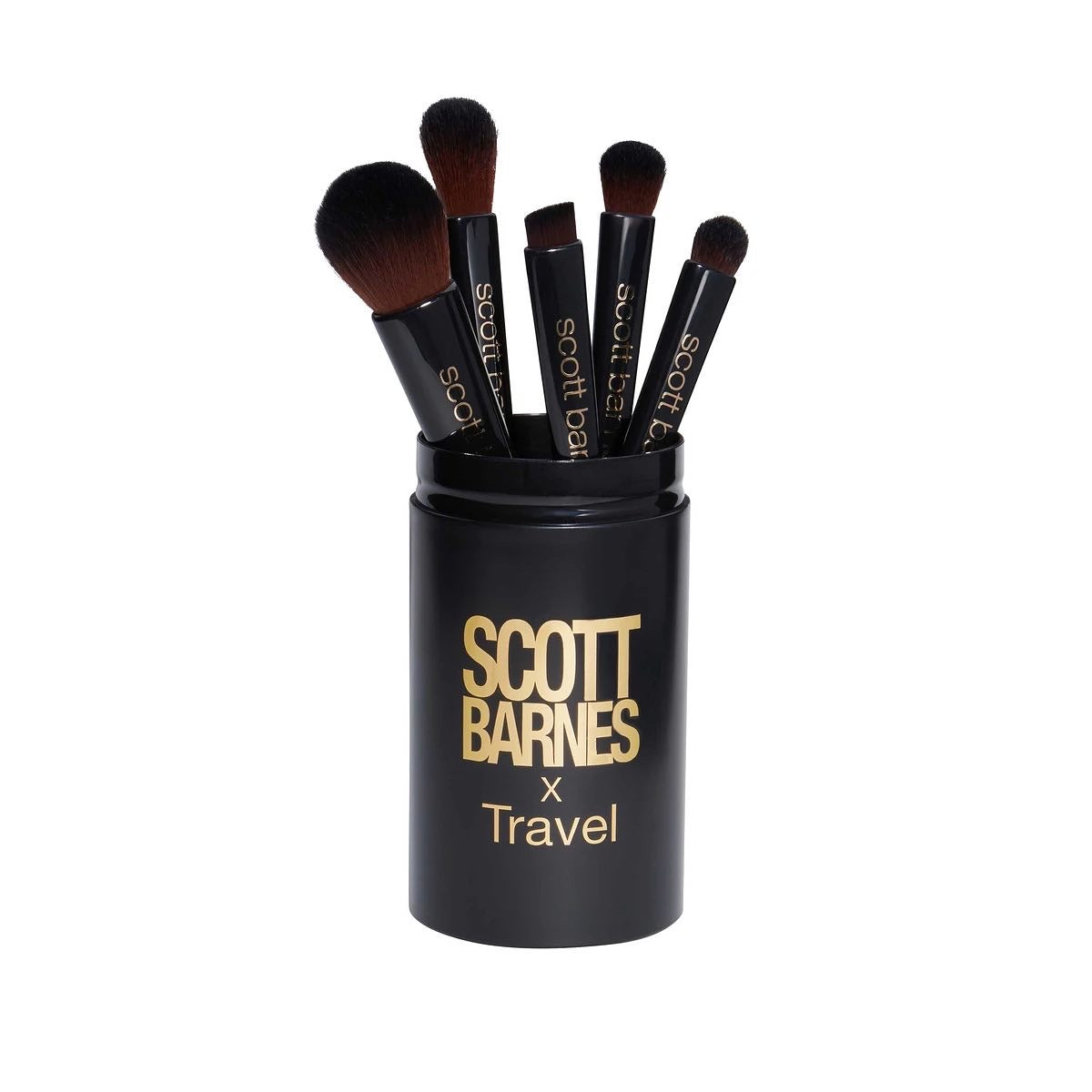 Estos cepillos están alojados en un elegante bote negro adornado con las palabras "Scott Barnes x TRAVEL" en oro, para un fácil almacenamiento mientras viaja.